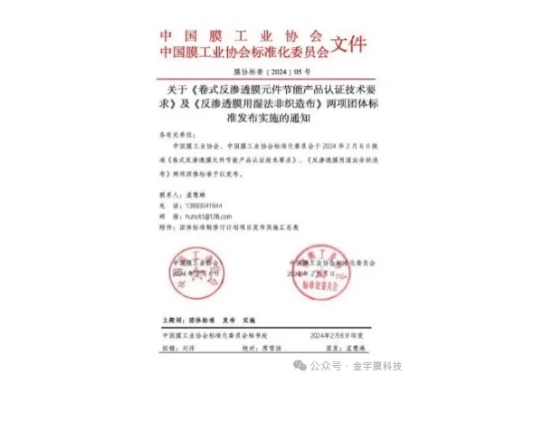 Shandong Jinyu Membrane Technology Development Co., Ltd. is a member unit of the China Membrane Industry Association and the developer of energy-saving reverse osmosis membrane industry standards. The China Membrane Industry Association and the Standardization Committee of the China Membrane Industry Association approved the release of two group standards, "Technical Requirements for Energy saving Product Certification of Roll type Reverse Osmosis Membrane Components" and "Wet Non woven Fabrics for Reverse Osmosis Membrane", on February 6, 2024.