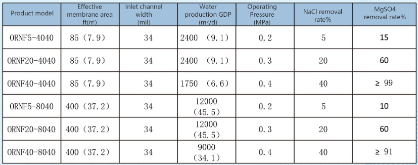 Processes such as oil-water separation, printing and dyeing wastewater, and leachate from garbage require deep removal of COD. ORNF-20 and ORNF-40 nanofiltration membranes can be selected, with high permeate flux, high COD removal rate, and low water production energy consumption.