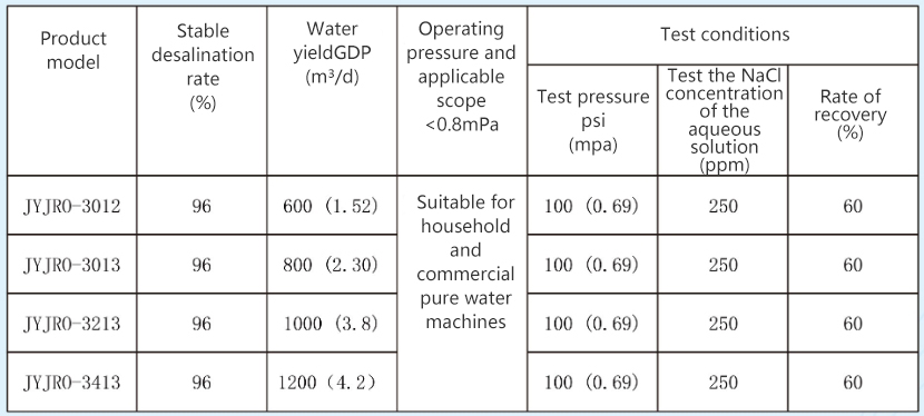 1. The test data is based on the following test conditions: the raw water is a 250 ppm NaCl solution, at 25 ℃, pH7.5, The operating pressure is 100 psi (0.69 Mpa), and the system recovery rate is 15%.