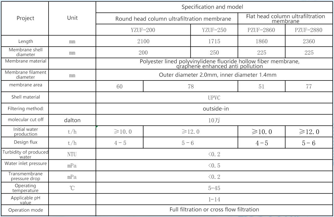 3. Internal and external pressure difference drive: The column ultrafiltration membrane uses the internal and external pressure difference to drive water flow through the membrane pores. Applying high pressure outside the membrane allows water molecules and small solute molecules to pass through the membrane pores, while large molecules and pollutants are retained on the membrane surface to form a concentrated solution. Through this method, impurities in water are effectively separated, achieving purification and separation of water.